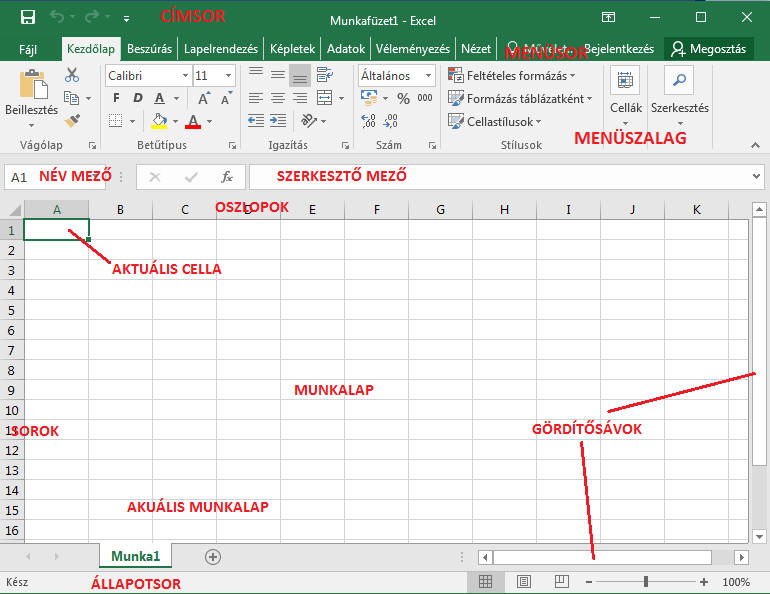 A Címsor bal sarkában a Mentés és a Visszavonás gombok láthatók. Középen a munkafüzet neve és a program neve, jobb sarokban a bezáró és a méretező gombok, előtte a Menüszalag megjelenését beállító gomb. A program menüje itt is háromszintű: felül a menüsor, alatta a menünek megfelelő tartalmú Menüszalag, ennek alján pedig a legördíthető almenük.