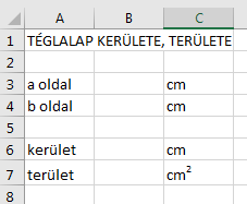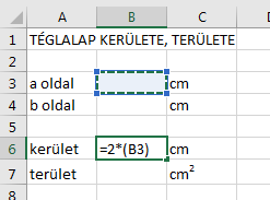 celláknak a tartalma jelenjen meg, amelybe az oldalak hosszát írtuk. A képlet elfogadásához kattintsunk a szerkesztő mező előtti pipára, vagy üssünk ENTERt! A B6 cella tartalma 0 lesz. Miért? A továbbiakban ehhez hasonló módon írjuk be a téglalap területének kiszámításához (t=a*b) a cellahivatkozásokkal átalakított képletet! (=B3*B4).