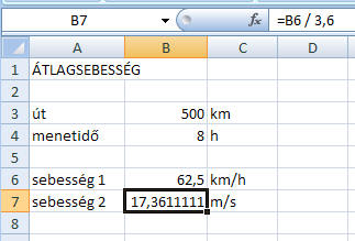 2., Készíts számolótáblát fizika órára, amely a km-ben megtett útból és az órában mért menetidőből kiszámítja az átlagsebességet km/h-ban, és az eredményt átszámolja m/s-ba is!