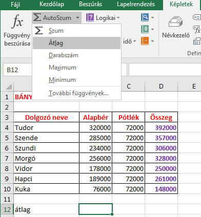 pótlékból áll, az összeget a kettő összege adja. A 12-es sor megfelelő cellájába kattintva válasszuk az AutoSzum függvény Átlag pontját! Az alapbérek átlagával nincs problémánk. A mellette levő cellába a pótlékok átlagát kell számítani. Az Excel azonban számot érzékel a közvetlenül mellette levő cellában is, és automatikusan a legközelebbi cellát jelöli be az argomentumban.