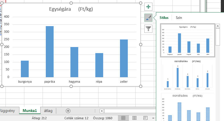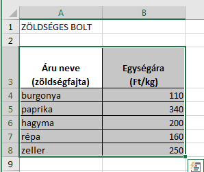 Nyissuk meg az elmúlt órákon elmentett Zöldségesbolt táblázatunkat! Ábrázoljuk grafikonon az egyes árufajták egységárát!