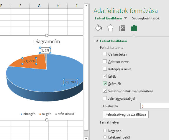 A diagram %-os arány kifejezésére alkalmas, tehát az oldat töménységét közvetlenül leolvashatjuk róla, ha a diagram területén jobb egérgombbal előhívott helyi menüből választjuk az Adatfeliratok formázása menüt és a Felirat beállításai panelon  bepipáljuk a Százalék menüpontot.