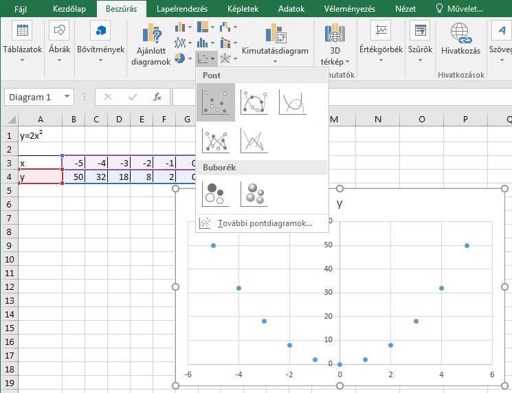 Beszúrás menü Pont-diagramjait! Az elkészítés után jól látható a torzult parabola függvény pontsora.