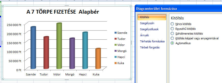2., Ábrázoljuk oszlopdiagramon a 7 törpe alapfizetését!