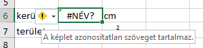 Lépjünk a B6 cellába! Írjuk be a téglalap kerületének képletét! =2*(a+b). Ezzel a képlettel a program még nem működik, és a következő hibaüzenetet kapjuk: (A hibaüzenet megjelenítéséhez a narancssárga, felkiáltó jelet tartalmazó négyzetre kell mutatnunk az egérrel.)