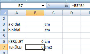 celláknak a tartalma jelenjen meg, amelybe az oldalak hosszát írtuk. A képlet elfogadásához kattintsunk a szerkesztő mező előtti pipára, vagy üssünk ENTERt! A B6 cella tartalma 0 lesz. Miért? A továbbiakban ehhez hasonló módon írjuk be a téglalap területének kiszámításához (t=a*b) a cellahivatkozásokkal átalakított képletet! (=B3*B4).