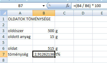 Ezek után írjunk be (ellenőrzésképpen még csak egyszerű, kis) számokat a B3 és B4 cellába! Vegyük észre, hogy a számok jóváhagyása után azonnal megjelenik a B6 és B7 cellákban az eredmény! Ellenőrizd, hogy a számítás helyes-e! Ha ezek után bármely bemenő adatot (B3 vagy B4 cellában) megváltoztatjuk, annak elfogadása után azonnal az új eredmény jelenik meg. Ez a dinamikus számolótábla. GYAKORLÓ FELADATOK: 1. Készítsünk számolótáblát kémia órára, az oldatok töménységének kiszámításához!