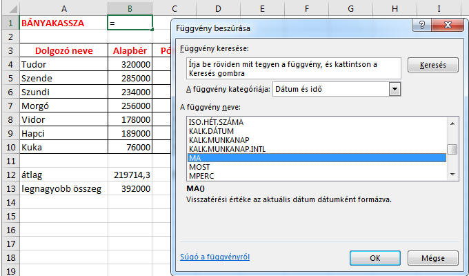A Bányakassza táblázatunkban kerestessük ki az alapbérek maximumát és minimumát! Kattintsunk a B13, illetve a B14 cellába, válasszuk az AutoSzum menü Maximum, illetve Minimum pontját, majd egérhúzással jelöljük ki a függvény által vizsgált cellatartományt, végül üssünk ENTERt!