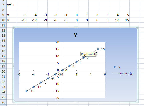 A függvény az y-értékeket különálló pontokként ábrázolja. A pontok összekötéséhez használjuk a pontra kattintva előhívható helyi menü Trendvonalak pontját! A program ekkor a pontokat folytonos vonallal összeköti és ki is írja a függvény típusát!