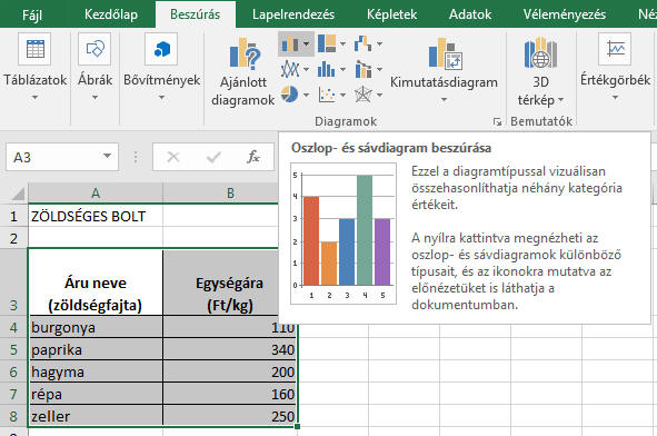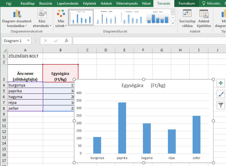 Nyissuk meg az elmúlt órákon elmentett Zöldségesbolt táblázatunkat! Ábrázoljuk grafikonon az egyes árufajták egységárát!
