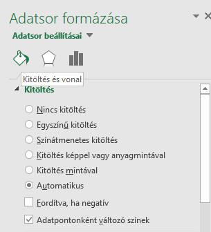 Ha a diagram sávjainak színét is meg kívánjuk változtatni, kattintsunk az egyik oszlopra jobb egérgombbal, majd a helyi menü Adatsorok formázása pontjára. A jobb oldalon megnyíló ablakban az Adatsor beállításai menüben a festékes vödör ikonra kattintva állíthatjuk be a kitöltés és a vonalszíneket. Ha bepipáljuk az Adatpontonként változó színek menüpontot, a gép minden oszlopot más színnel jelöl. Ha a színek jelentését jelmagyarázatban szeretnénk feltüntetni, kattintsunk a Diagram-összetevők jobb oldalon megjelenő (+) gombjára, és pipáljuk be a Jelmagyarázat jelölő négyzetet!