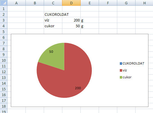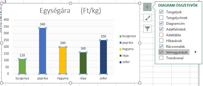 A program érzékeli a kijelölt oszlopok közötti kapcsolatot, és ennek megfelelően készíti el a diagramot. A diagram címe az számértékeket tartalmazó oszlop fejléce lesz, a zöldségfajtákat szöveggel tünteti fel a program.