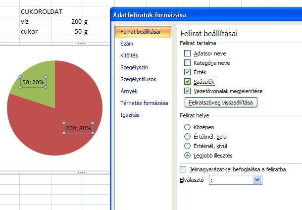 A diagram %-os arány kifejezésére alkalmas, tehát az oldat töménységét közvetlenül leolvashatjuk róla, ha a diagram területén jobb egérgombbal előhívott helyi menüből választjuk az Adatfeliratok formázása menüt és a Felirat beállításai panelon  bepipáljuk a Százalék menüpontot.